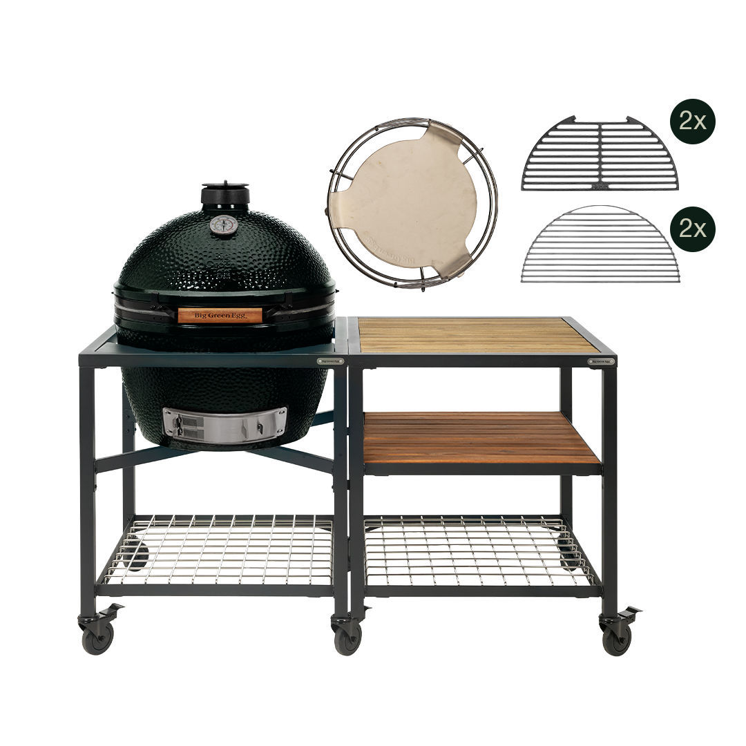 Dit pakket bevat The Onyx XLarge, een EGG Frame en Expansion Frame met twee Acacia Wood Inserts, de convEGGtor plus Bssket, twee Half Cast Iron Grids, twee Stainless Steel Half Grids en caster kits. Alles wat je nodig hebt voor de perfecte buitenkookervaring.